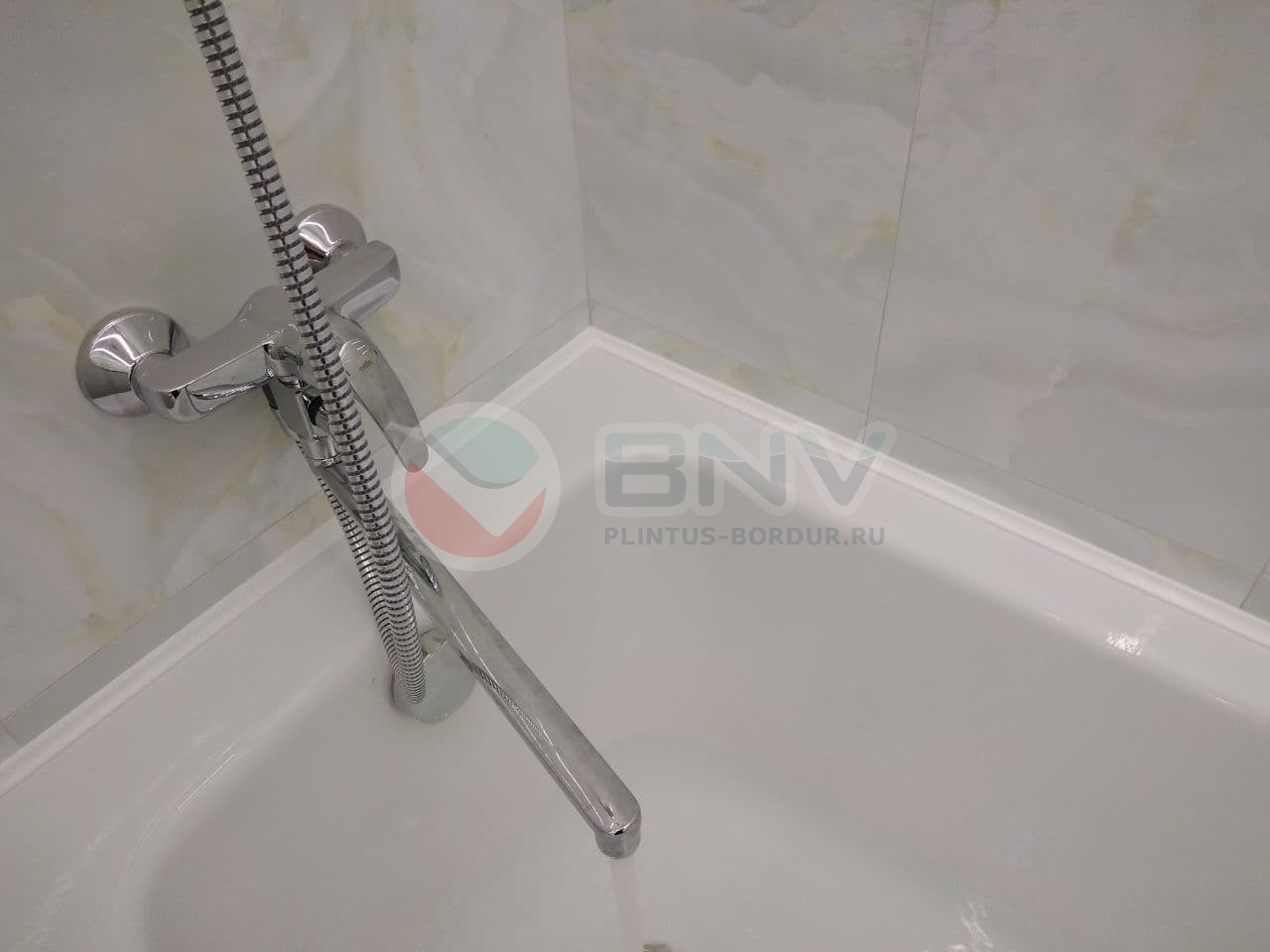 Однако, если вы выложили бордюр без клея и силикона на ванну и вы видите, что зазоры слишком большие, то мы рекомендуем: нанести на плинтус клей, который устойчив к влаге и быстро схватывается, и максимально плотно приклеить плинтус, перекрывая им зазоры, причем таким образом, чтобы открытого силикона осталось как можно меньше.